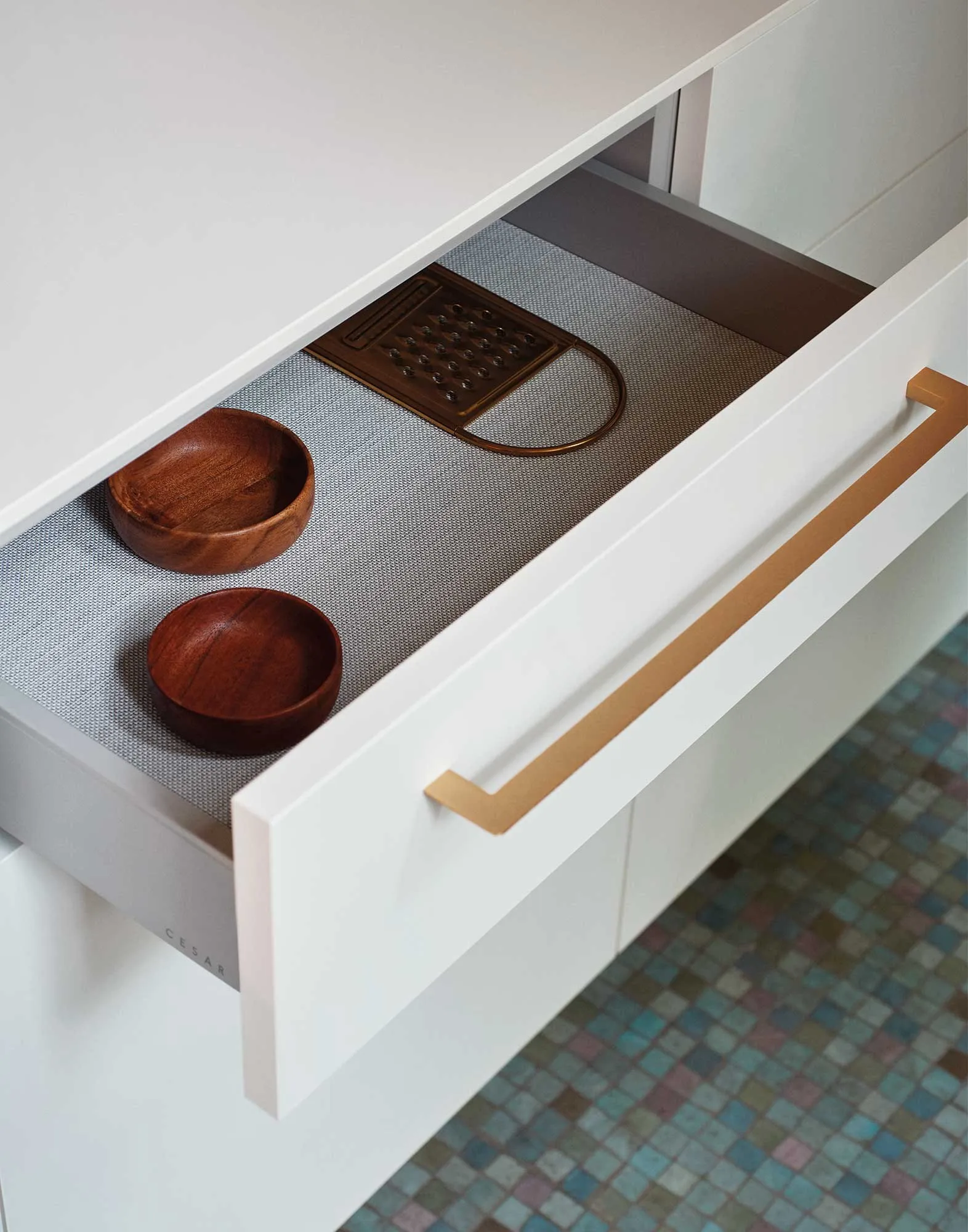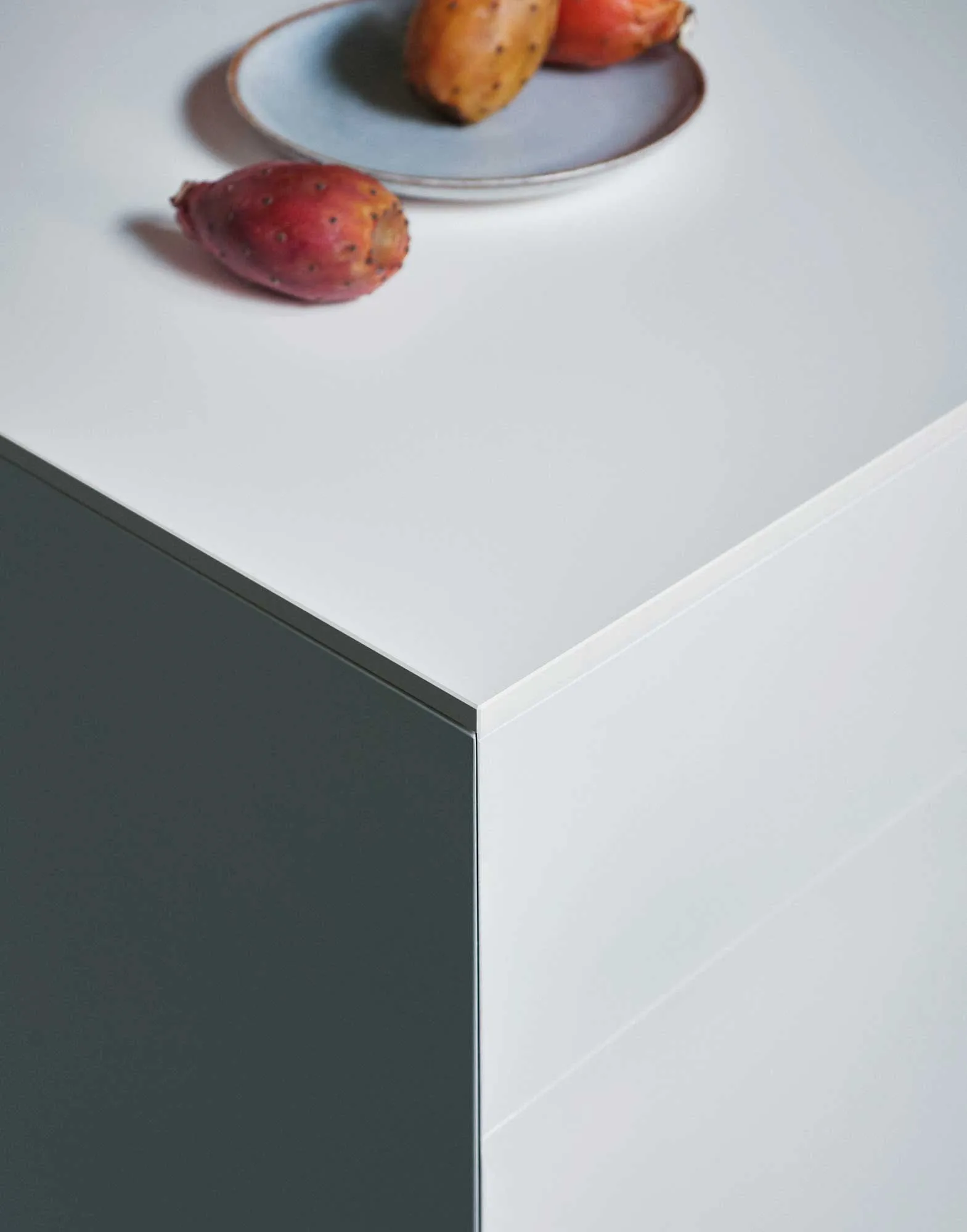 Island and tall units: Technomat Meringa doors and panels, Champagne plinth, groove, and Eero handles.