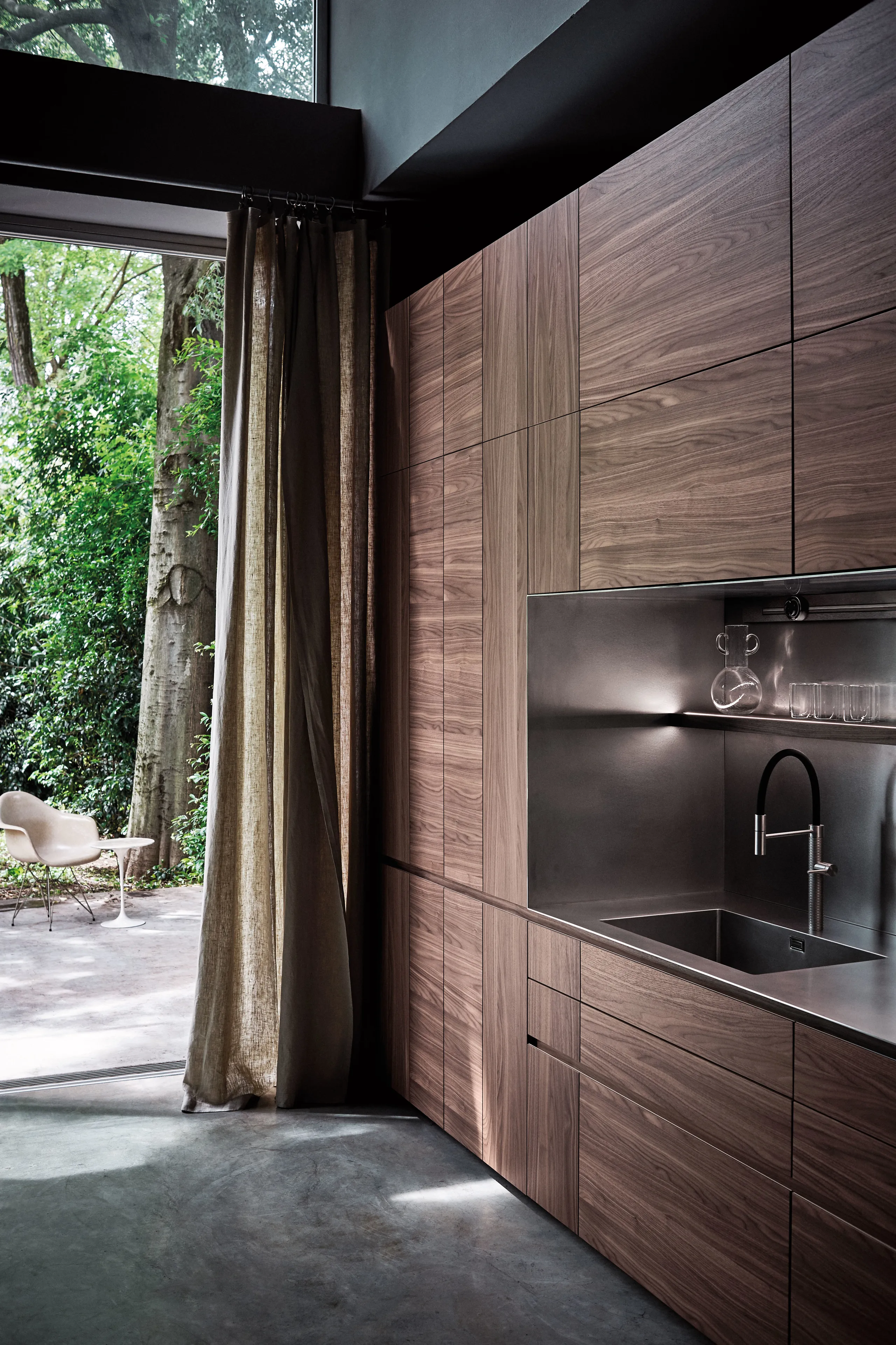 Noce Desaturato Intarsio wood, inox mat steel, Rovere Corvino wood, Fenix Nero