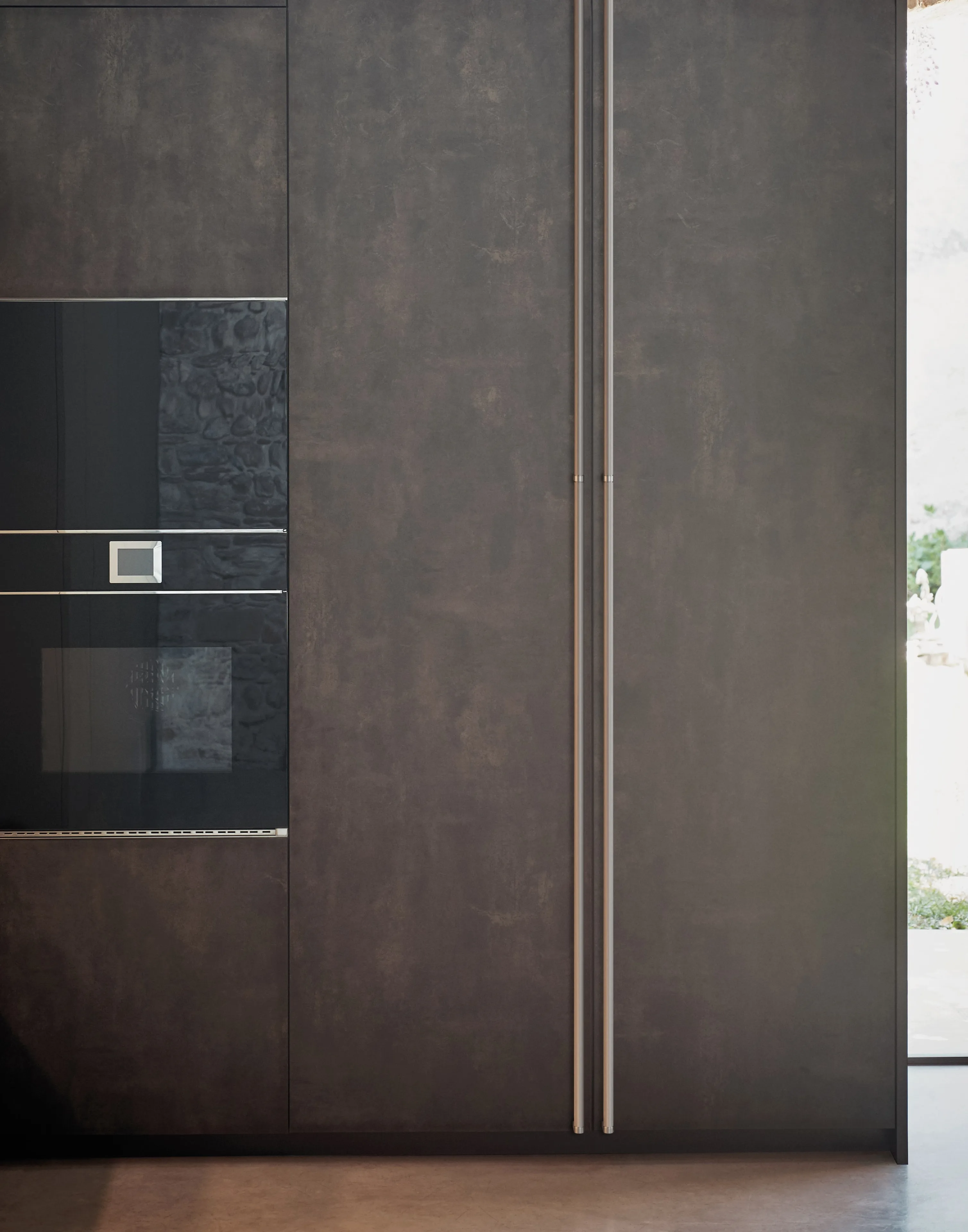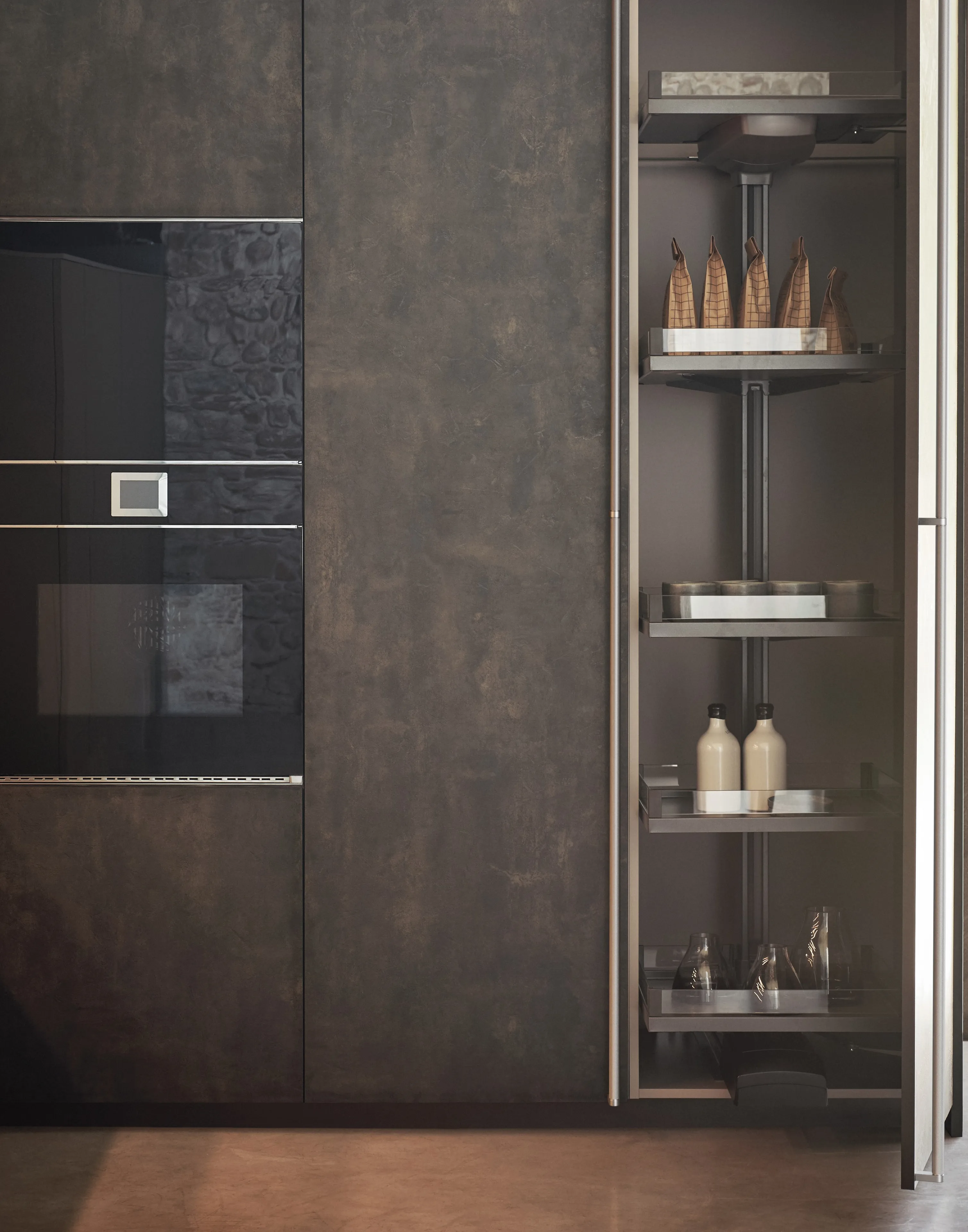 Tall units: Ossido Ghisa melamine with knurled Inox Pipe handle.