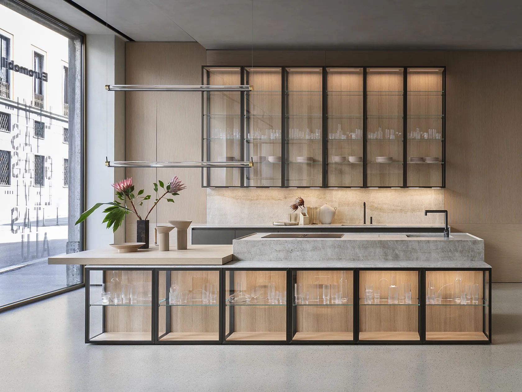 Levitas Glass features an aged brass lacquered aluminum frame and transparent extra-clear glass doors for wall units, bases, and tall units, both on the front and the sides. Backs of bases and wall units in Naturale sanded-effect oak, with tall units having glass backs. Panelling in Wood caneté plus Natural. The central island’s worktop Work, along with its corresponding sides, is in Taj Mahal quartzite natural stone, and the Fast sliding snack top, 6 cm thick, is in Naturale sanded-effect oak. In Levitas Alu, the 22 mm thick aluminum honeycomb door is in aged brass lacquer finish aluminum. In addition to the doors of the wall bases, it is also on the inside of the island bases.