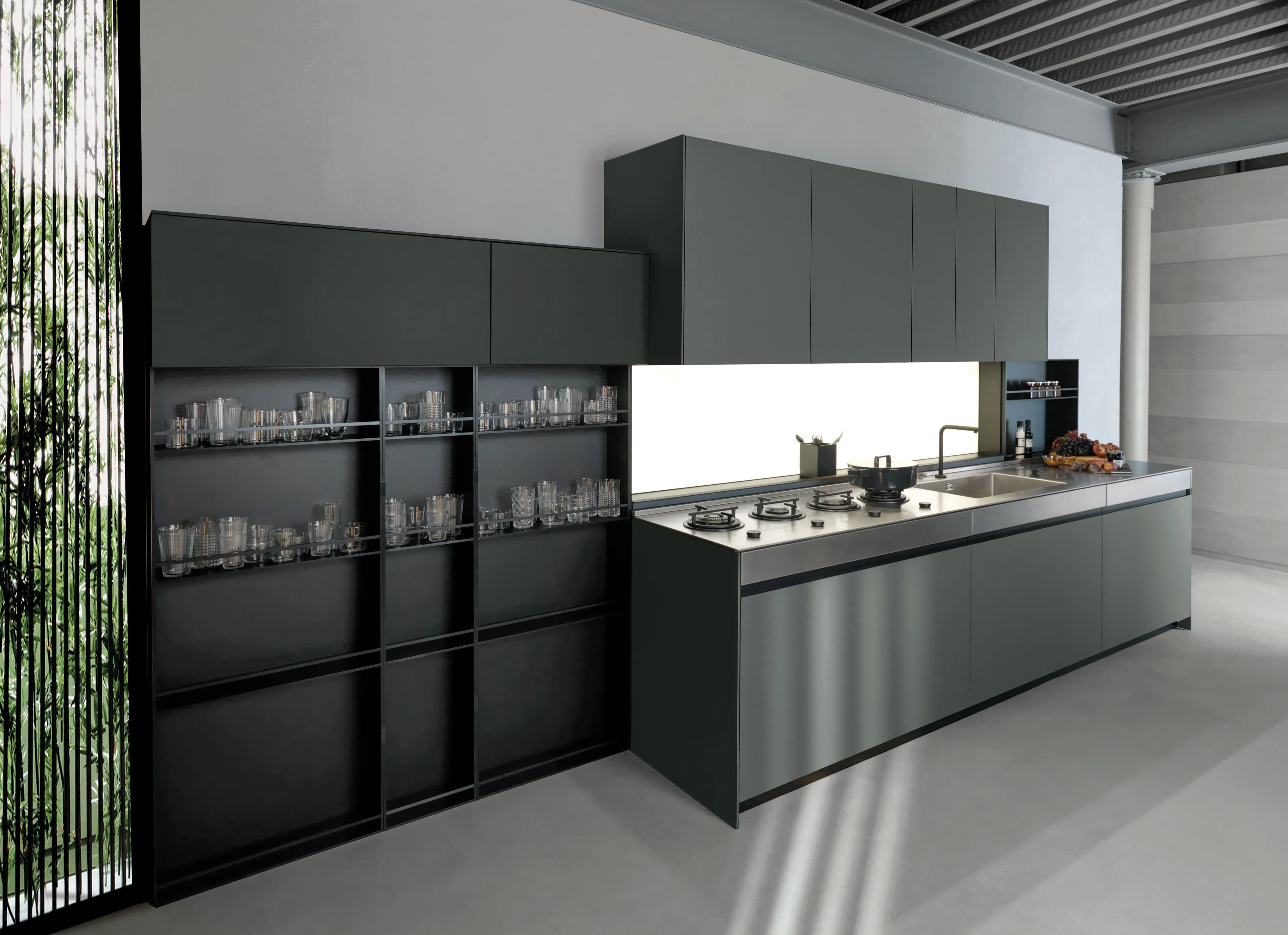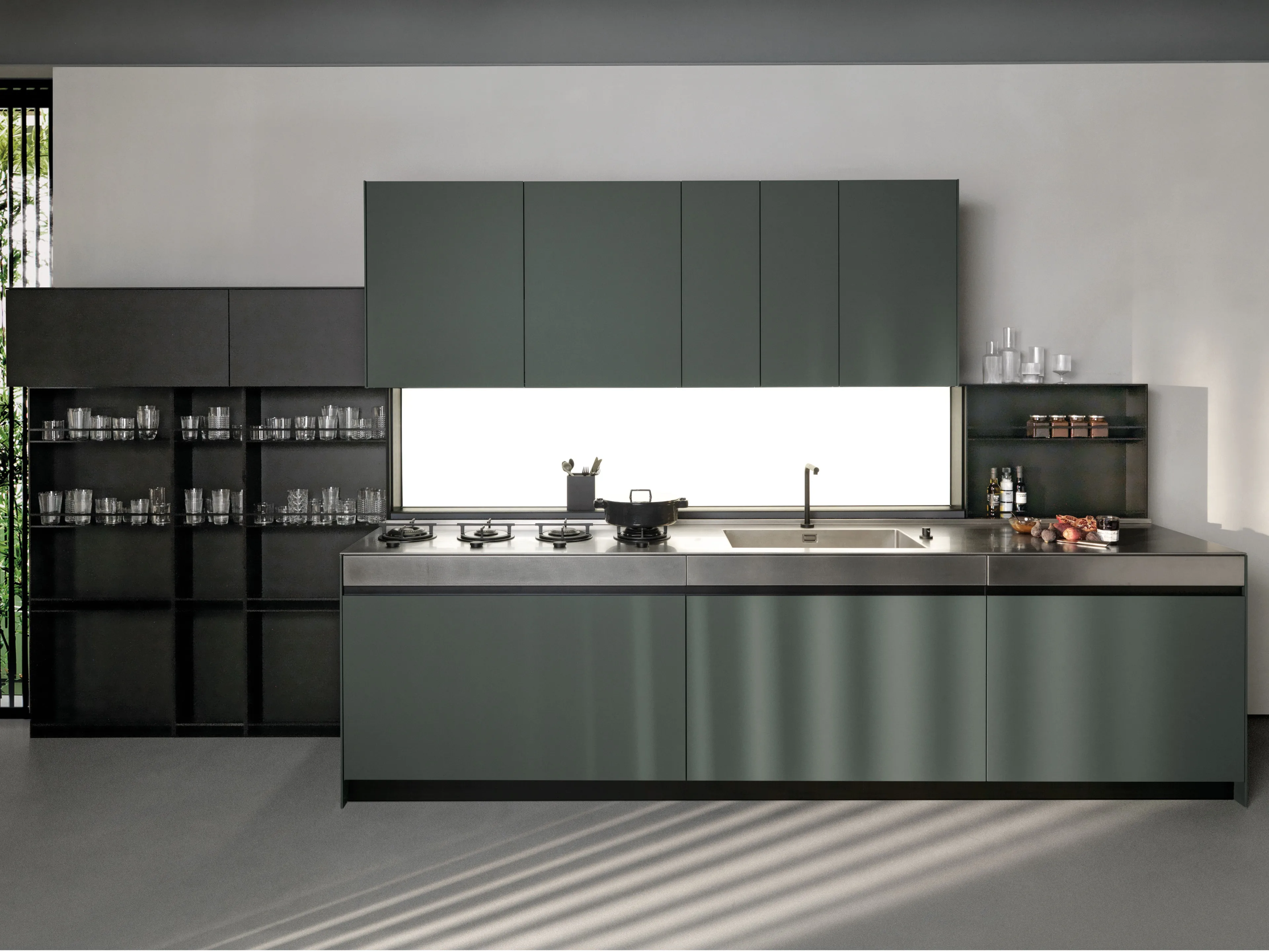 Sei 02 is a comodoro green Fenix NTM® and antique stainless steel wall fronts and worktop.‎ Black anodized aluminium handle
