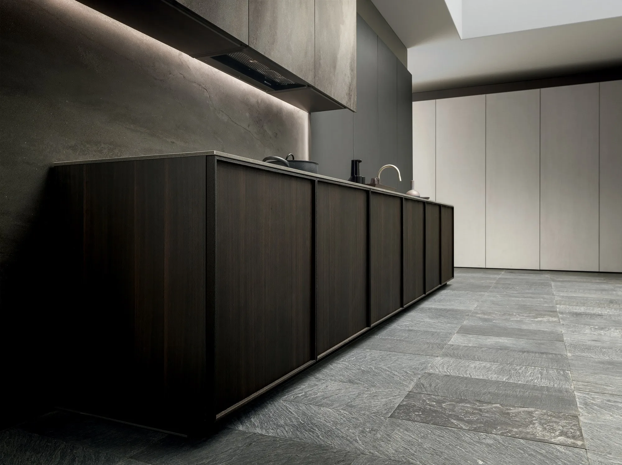 Frame Blade is an innovative solution with vintage gris stoneware matches the illuminated boiserie in the same material, creating an extremely elegant effect of filled spaces and voids. The 75cm wide base unit doors exalt the linearity of the entire project.